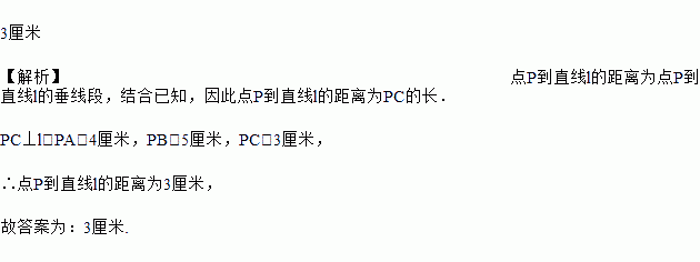 如图所示,A,B,C是直线l上的三点,P为直线l外一点,已知PC⊥l,PA=4厘米,PB=5厘米,PC=3厘米,则点P到直线l的距离为__________.