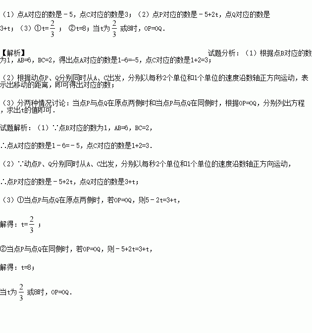 如图,数轴的原点为0,点A、B、C是数轴上的三点,点B对应的数位1,AB=6,BC=2,动点P、Q同时从A、C出发,分别以每秒2个长度单位和每秒1个长度单位的速度沿数轴正方向运动.设运动时间为t秒(t>0)