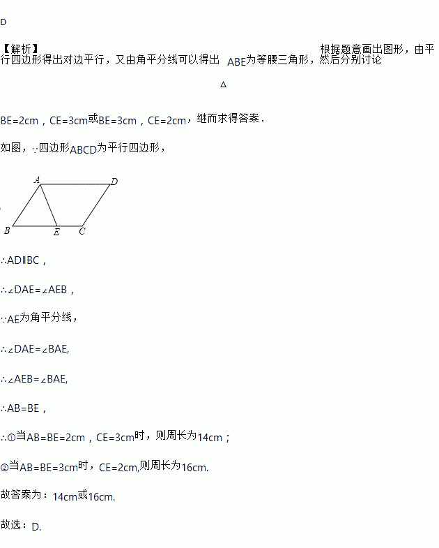平行四边形的一个内角平分线把平行四边形一条边分成2 cm和3 cm两部分,则平行四边形的周长为( ).