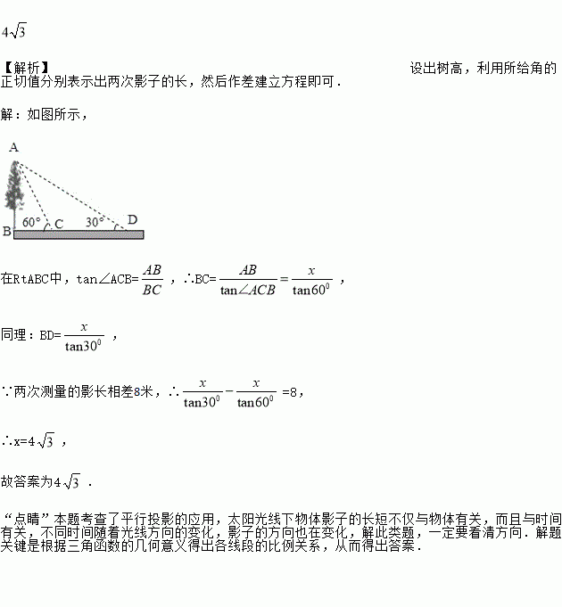 如图,校园内有一棵与地面垂直的树,数学兴趣小组两次测量它在地面上的影子,第一次是阳光与地面成60°角时,第二次是阳光与地面成30°角时,两次测量的影长相差8米,则树高_____________米(结果保留根号).