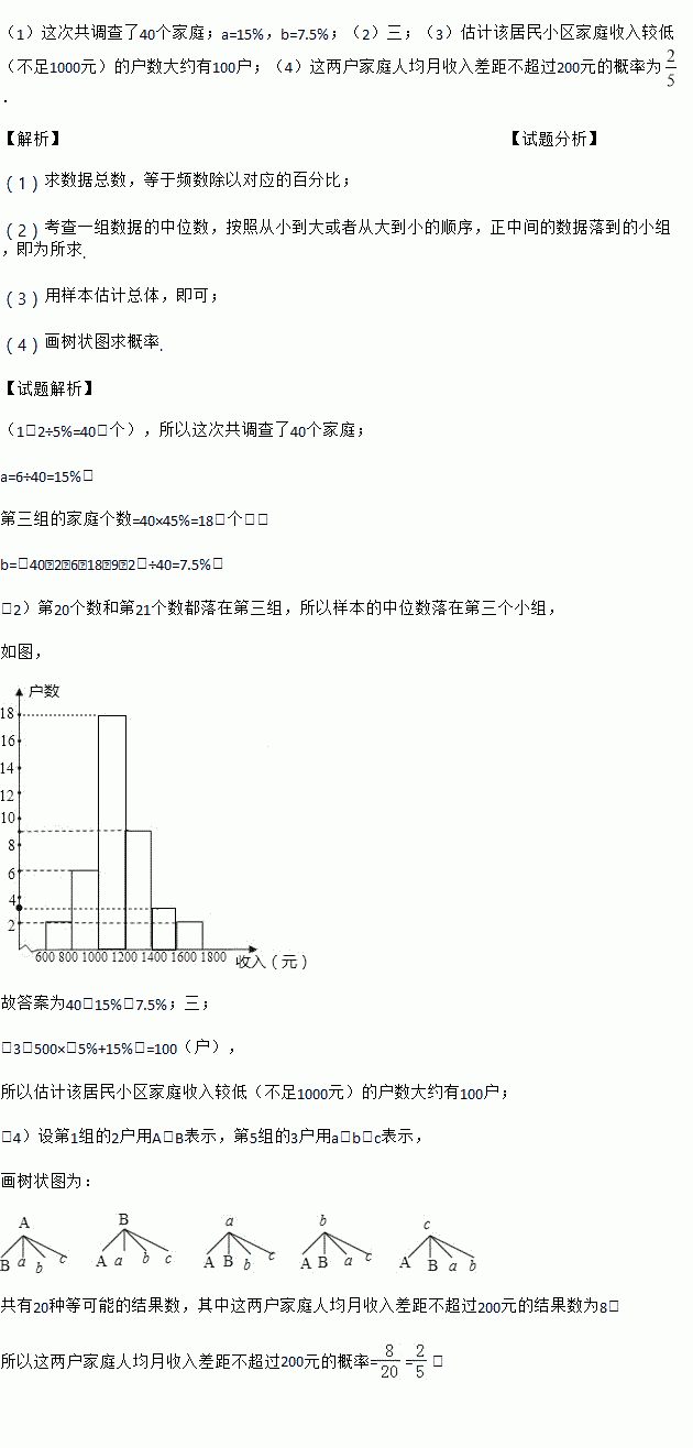 (4)在第1组和第5组的家庭中,随机抽取2户家庭,求这两户家庭人均月收入差距不超过200元的概率.