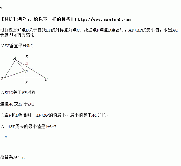 如图,在△ABC中,AB=3,AC=4,BC=5,EF垂直平分BC,点P为直线EF上一动点,则△ABP周长的最小值是_____.