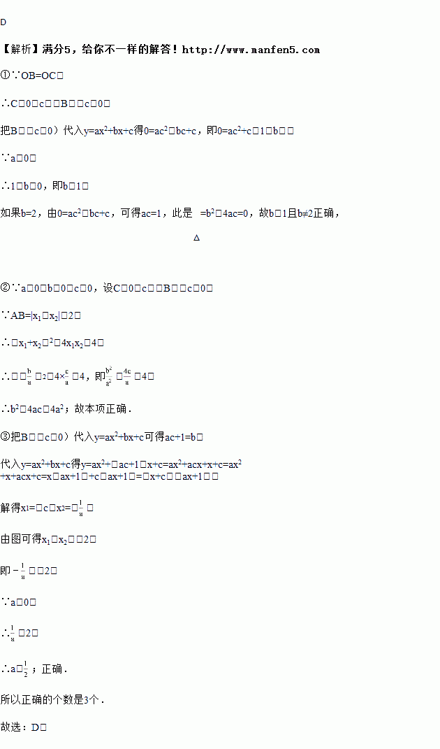 如图,二次函数y=ax2+bx+c的图象与x轴交于A、B两点,与y轴交于点C,且OB=OC,下列结论:①b>1且b≠2;②b2﹣4ac<4a2;③a>