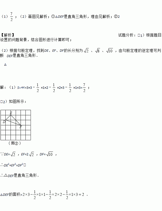 (1);(2)画图见解析;①△DEF是直角三角形,理由见解析;②2 【解析】试题分析:(1)根据题目设置的问题背景,结合图形进行计算即可; (2)根据勾股定理,找到DE、EF、DF的长分别为、、,由勾股定理的逆定理可判断△DEF是直角三角形. 【解析】 (1)S△ABC=3×3﹣×1×2﹣×2×3﹣×1×3=; (2)如图所示: ∵DE=,EF=2,DF=, ...