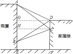 如图,“五•一”期间在某商贸大厦上从点A到点B悬挂了一条宣传条幅,小明和小雯的家正好住在商贸大厦对面的家属楼上,小明在四楼D点测得条幅端点A的仰角为30°,测得条幅端点B的俯角为45°;小雯在三楼仰角为45°,测得条幅端点B的俯角为30°.若设楼层高度CD为3米,请你根据小明和小雯测得的数据求出条幅AB的长.