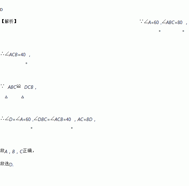 D 【解析】∵∠A=60°,∠ABC=80°, ∴∠ACB=40°, ∵△ABC≌△DCB, ∴∠D=∠A=60°,∠DBC=∠ACB=40°,AC=BD, 故A,B,C正确, 故选D.