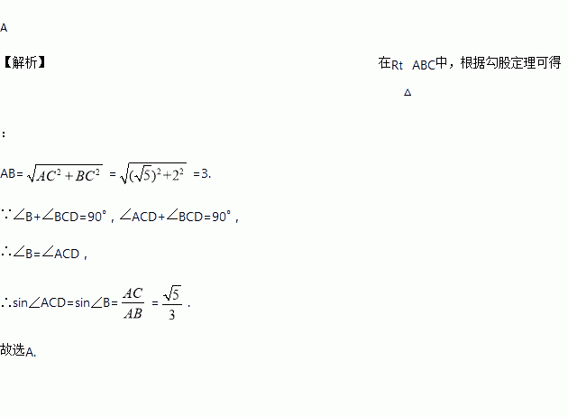 如图,在Rt△ABC中,∠ACB=90°,CD⊥AB,垂足为D.若AC=,BC=2,则sin∠ACD的值为( )