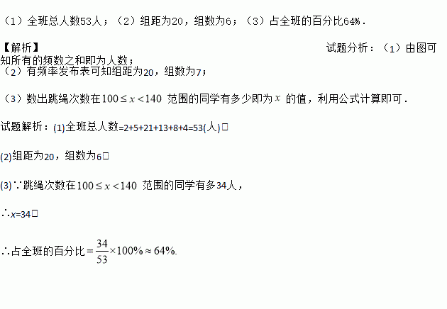 (3)跳绳次数在100≤x<140范围内同学有多少人,占全班的百分之几(精确到0.01%)?