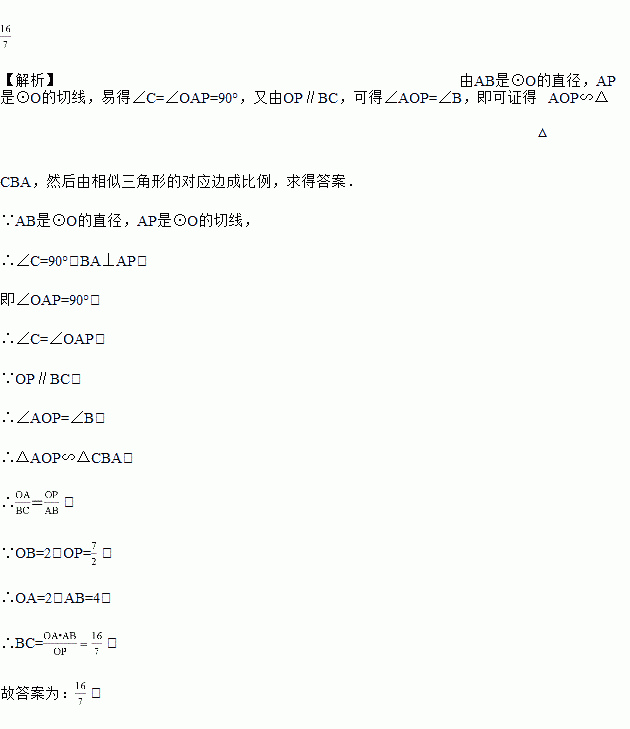 如图,已知AB是⊙O的直径,过点O作弦BC的平行线,交过点A的切线AP于点P,连结AC.若OB=2,OP=,则BC的长为___________.