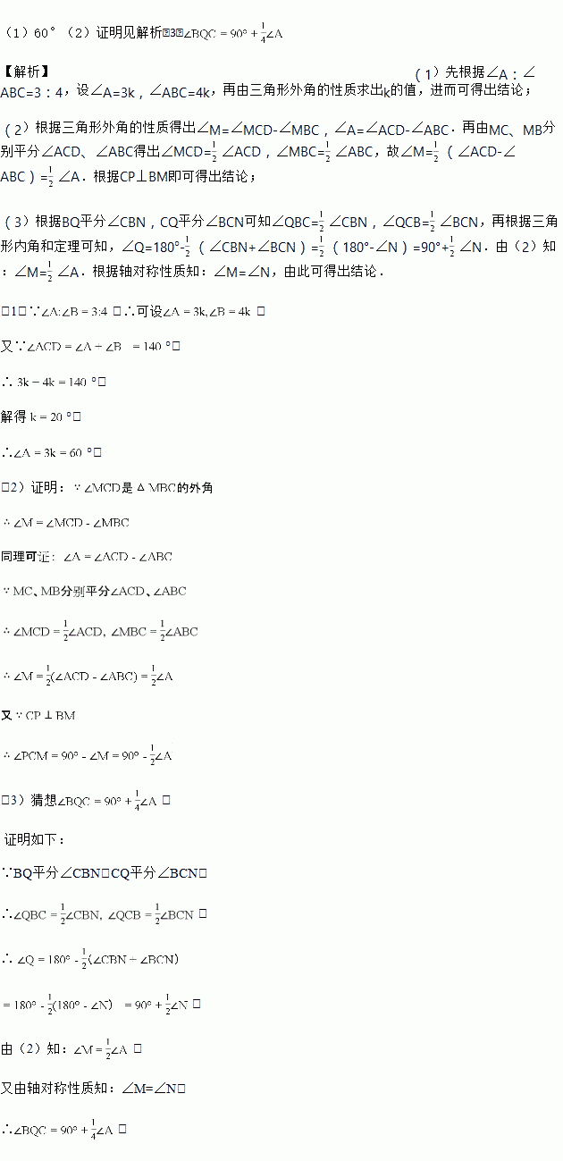 (3)在(2)的条件下,将△MBC以直线BC为对称轴翻折得到△NBC,∠NBC的角平分线与∠NCB的角平分线交于点Q(如图2),试探究∠BQC与∠A有怎样的数量关系,请写出你的猜想并证明.
