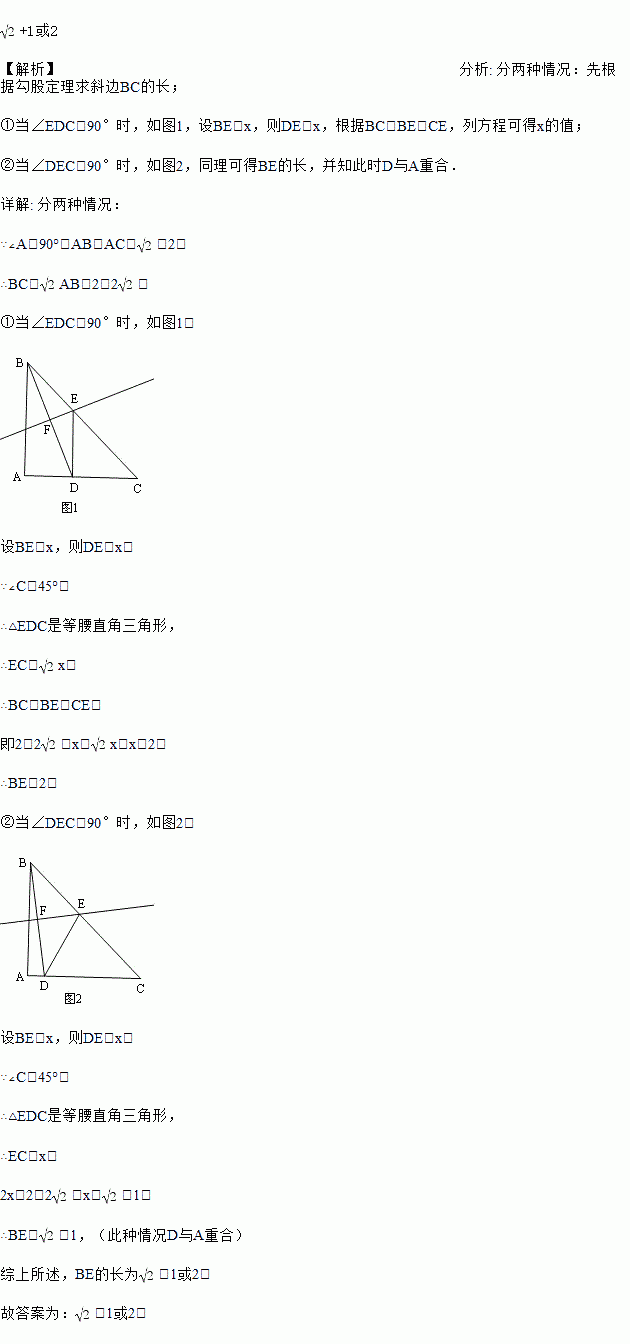 在Rt△ABC中,∠A=90°,AB=AC=+2,D是边AC上的动点,BD的垂直平分线交BC于点E,连接DE,若△CDE为直角三角形,则BE的长为_____.