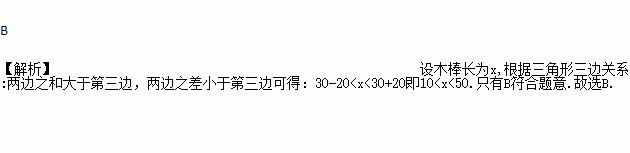 有两根木棒,它们的长分别是20厘米和30厘米,若不改变木棒的长度,要钉成一个三角形木棒,则应在下列木棒中选取 ( )