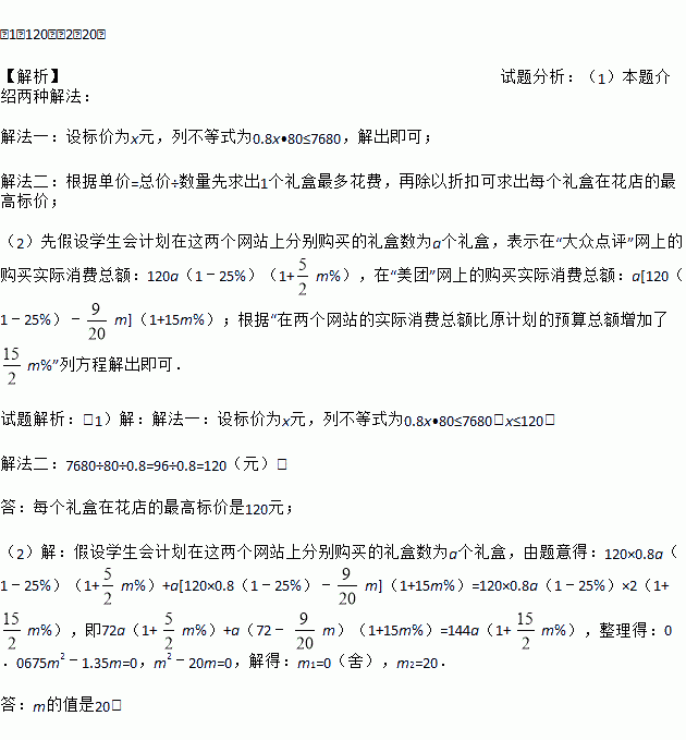 (1)经过和花店卖家议价,可在原标价的基础上打八折购进,若在花店购买80个礼盒最多花费7680元,请求出每个礼盒在花店的最高标价;(用不等式解答)