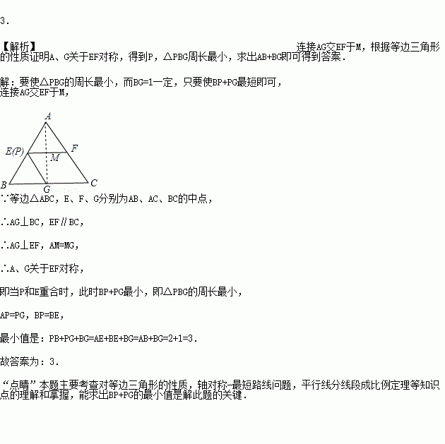 如图所示,在边长为2的正三角形ABC中,E、F、G分别为AB、AC、BC的中点,点P为线段EF上一个动点,连接BP、GP,则△BPG的周长的最外值是____________.