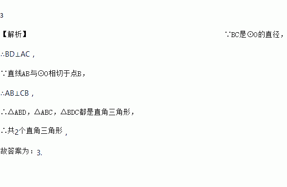 如图,直线AB与⊙O相切于点B,BC是⊙O的直径,AC交⊙O于点D,连结BD,则图中直角三角形有______个.