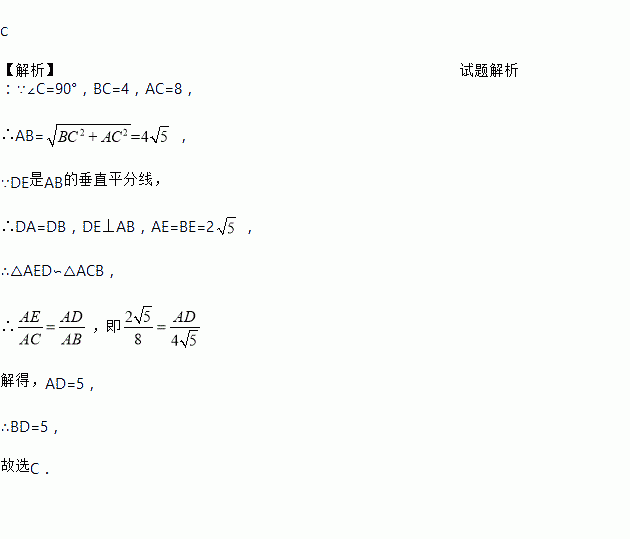 如图,在Rt△ABC中,∠C=90°,边AB的垂直平分线交AC于点D,交AB于点E.若BC=4,AC=8,则BD=( )
