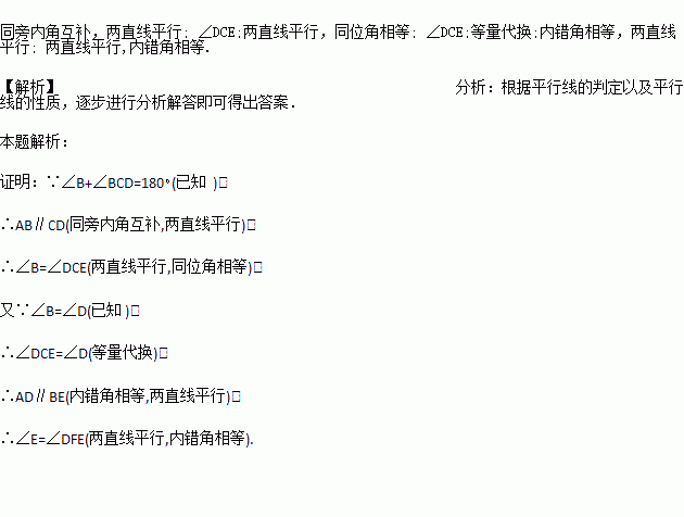 证明:∵∠B+∠BCD=180°( 已知 ),