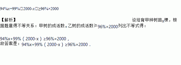 某苗圃计划培育甲、乙两种树苗共2000棵,据统计这两种树苗的成活率分为94%和99%,要使这批树苗的成活率不低于96%,求培育甲种树苗至多为多少棵?高培育甲种树苗x棵,根据题意列出的不等式是__________.