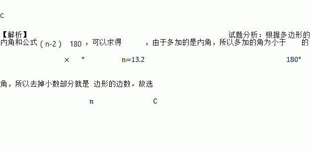 C 【解析】试题分析:根据多边形的内角和公式(n-2)×180°,可以求得n=13.2,由于多加的是内角,所以多加的角为小于180°的角,所以去掉小数部分就是n边形的边数。故选C