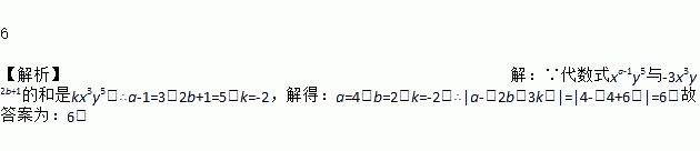 6 【解析】【解析】 ∵代数式xa-1y5与-3x3y2b+1的和是kx3y5,∴a-1=3,2b+1=5,k=-2,解得:a=4,b=2,k=-2.∴|a-(2b-3k)|=|4-(4+6)|=6.故答案为:6.