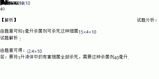 一种被污染的液体每升含有2.4×1013个有害细菌,为了试验某种杀菌剂的效果,科学家们进行了实验,发现1滴杀菌剂可以杀死4×1010个此种细菌,要将1升液体中的有害细菌全部杀死,需要这种杀菌剂多少毫升?(注:15滴=1毫升)