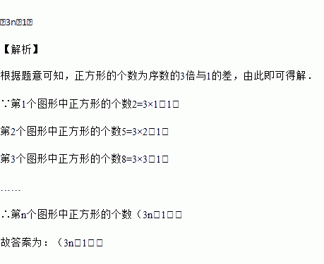 如图是一组有规律的图案,它们是由边长相同的小正方形组成,第(1)个图案有2个正方形,第(2)个图案共有5个正方形,第(3)个团案共有8个正方形,…,依此规律,第n(n>1)个图案共有_____个正方形(用含n的代数式表示)