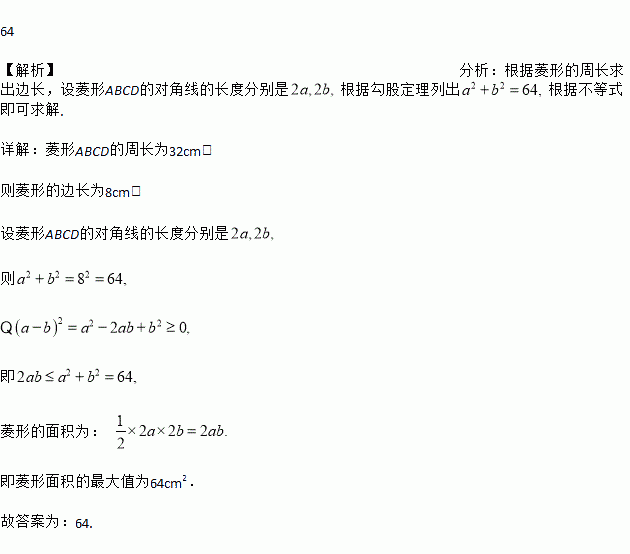菱形ABCD的周长为32cm,则菱形ABCD的面积的最大值是_________cm2.