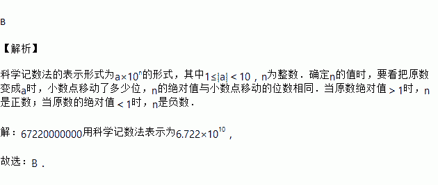 据甘肃省财政快报统计,2014年全省财政收入672220000000元,67220000000用科学记数法表示为( )