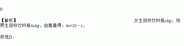 在“爱护环境,建我家乡”的活动中,七(1)班学生回收饮料瓶共10kg,男生回收的质量是女生的4倍,设女生回收饮料瓶x kg,根据题意可列方程为( )