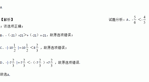 A. ﹣ <﹣ B. ﹣(﹣21)<+(﹣21) C. ﹣|﹣10|>8 D. ﹣|﹣7|=﹣(﹣7)