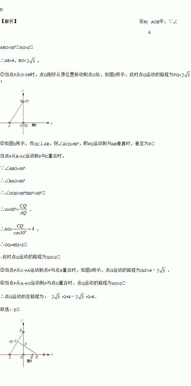 如图,在直角坐标系中,点A,B分别在x轴和y轴上,点A的坐标为(﹣2,0),∠ABO=30°,线段PQ的端点P从点O出发,沿△OBA的边按O→B→A→O运动一周,同时另一端点Q随之在x轴的非负半轴上运动,如果PQ=2
