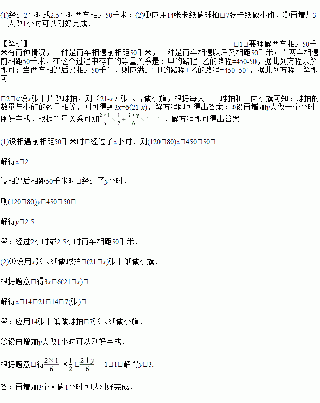 (2)某中学举行校运会,七年级(1)班同学准备用卡纸制成乒乓球拍和小旗作道具.若一张卡纸可以做3个球拍或6面小旗,用21张卡纸,刚好能够让每位同学拿一个球拍和一面小旗.