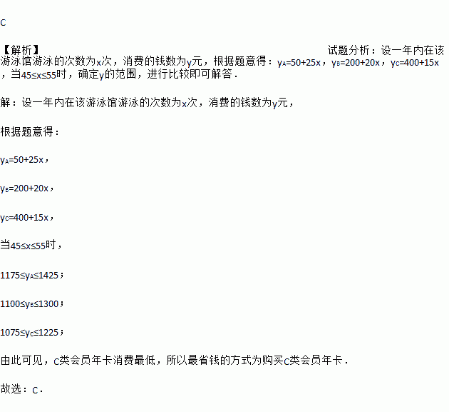 ÀýÈ磬¹ºÂòAÀà»áÔ±Ä꿨£¬Ò»ÄêÄÚÓÎÓ¾20´Î£¬Ïû·Ñ50£«25¡Á20£½550Ôª£¬ÈôÒ»ÄêÄÚÔÚ¸ÃÓÎÓ¾¹ÝÓÎÓ¾µÄ´ÎÊý½éÓÚ45¡«55´ÎÖ®¼ä£¬Ôò×îʡǮµÄ·½Ê½Îª( )
