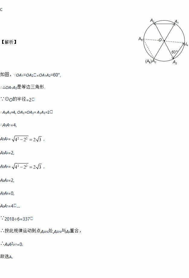 如图所示,一动点从半径为2的⊙O上的A0点出发,沿着射线A0O方向运动到⊙O上的点A1处,再向左沿着与射线A1O夹角为60°的方向运动到⊙O上的点A2处;接着又从A2点出发,沿着射线A2O方向运动到⊙O上的点A3处,再向左沿着与射线A3O夹角为60°的方向运动到⊙O上的点A4处;…按此规律运动到点A2018处,则点A2018与点A0间的距离是( )