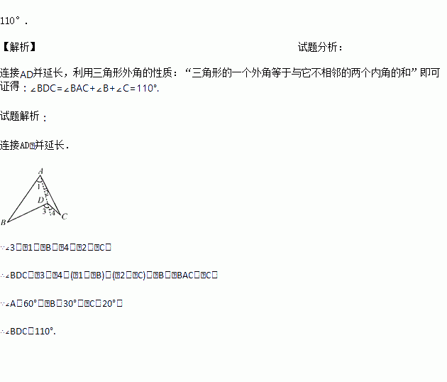 已知∠A=60°,∠B=30°,∠C=20°,求∠BDC的度数.