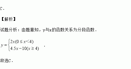 2014年6月3日中央新闻报道,为鼓励居民节约用水,北京市将出台新的居民用水收费标准:若每月每户居民用水不超过4m3,则按每立方米2元计算;若每月每户居民用水超过4m3,则超过部分按每立方米4.5元计算(不超过部分仍按每立方米2元计算)。现假设该市某户居民用水x m3,水费为y元,则y与x的函数关系式用图象表示正确的是