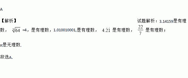 A 【解析】试题解析:3.14159是有理数, =4,是有理数,1.010010001,是有理数, 是有理数, 是有理数; π是无理数. 故选A.