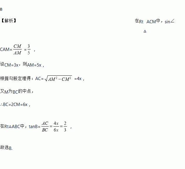 如图,在Rt△ABC中,∠C=90°,AM是BC边上的中线,sin∠CAM=,则tanB的值为( )