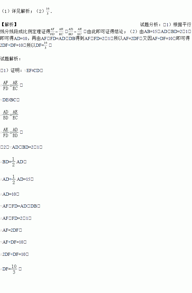 (2)若AB=15,AD:BD=2:1,求DF的长.