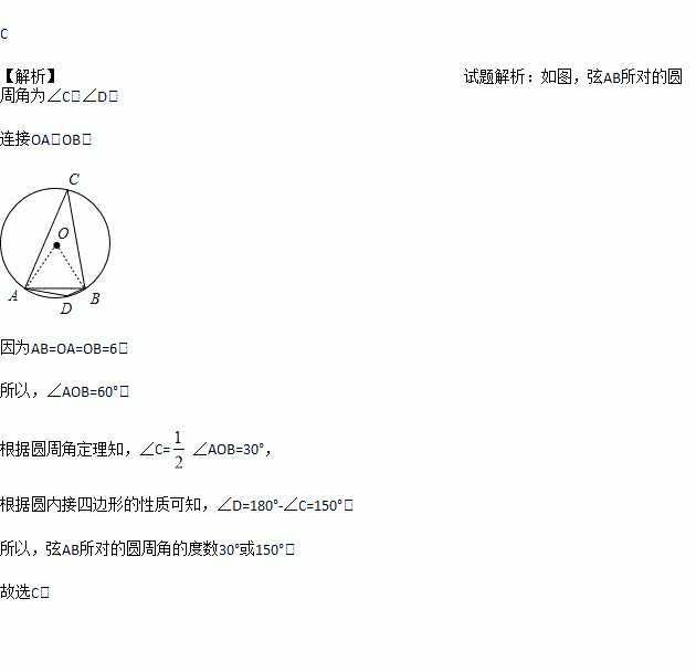在半径为6cm的圆中,长为6cm的弦所对的圆周角的度数为( )