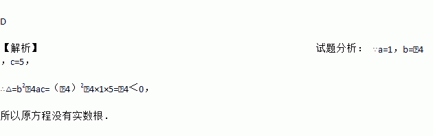 D 【解析】试题分析: ∵a=1,b=﹣4,c=5, ∴△=b2﹣4ac=(﹣4)2﹣4×1×5=﹣4<0, 所以原方程没有实数根.
