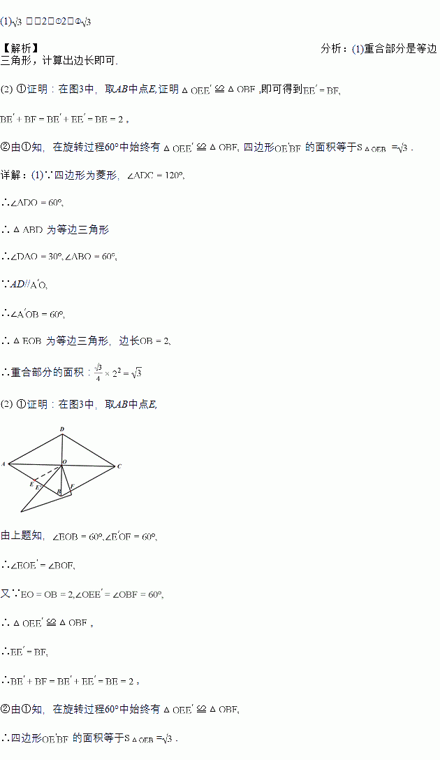 (1)如图2,将△AOD沿DB平移,使点D与点O重合,求平移后的△A′BO与菱形ABCD重合部分的面积.