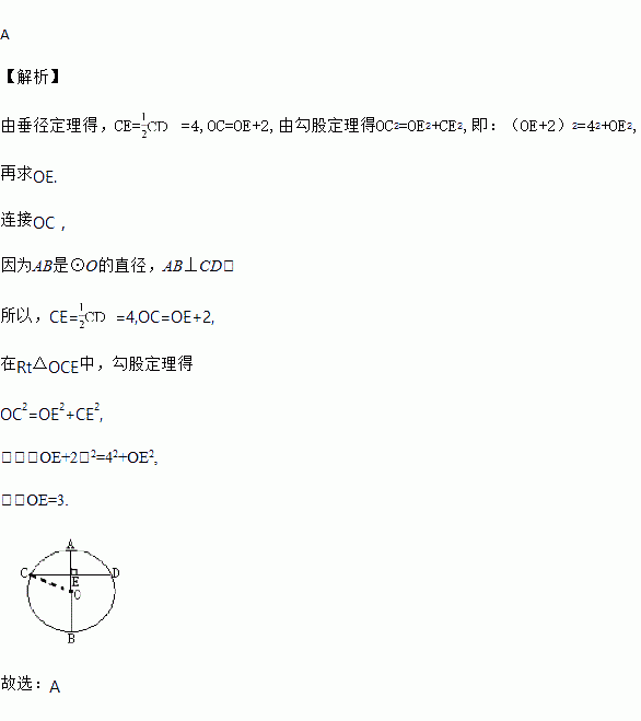 如图,AB是⊙O的直径,AB⊥CD于点E,若CD=8,AE=2,则OE长为( )