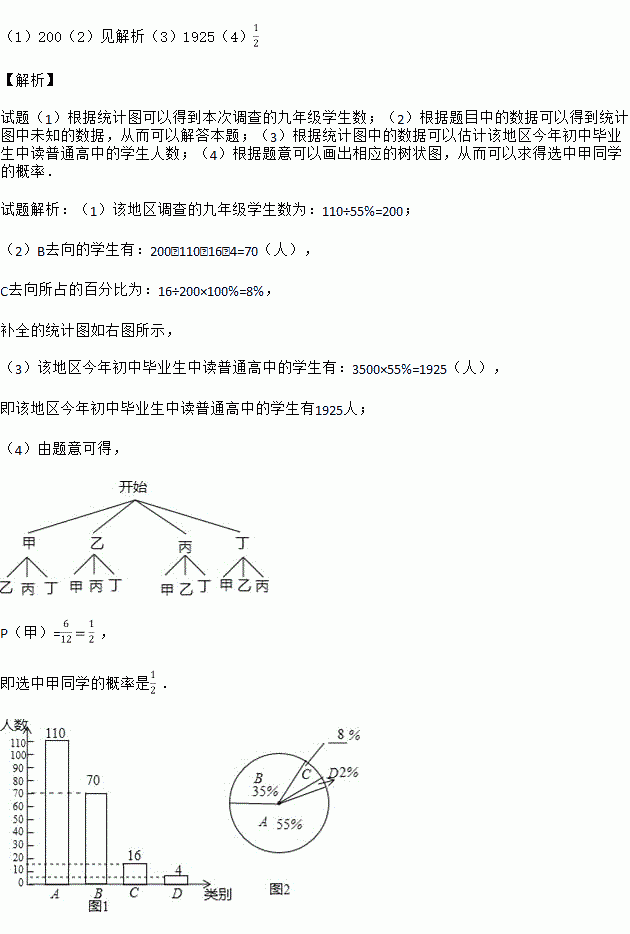 (4)老师想从甲、乙、丙、丁4位同学中随机选择两位同学了解他们毕业后的去向情况,请用画树状图或列表的方法求选中甲同学的概率.