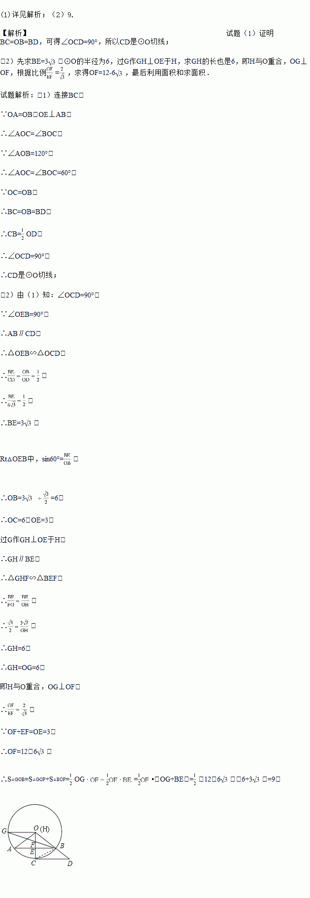 △OAB是⊙O的内接三角形,∠AOB=120°,过O作OE⊥AB于点E,交⊙O于点C,延长OB至点D,使OB=BD,连CD.