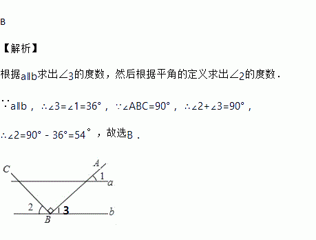 如图,a∥b,点B在直线b上,且AB⊥BC,若∠1=36°,则∠2的大小为( )