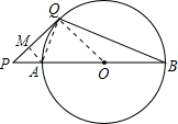 分析:连接OQ,AQ,过A作AM⊥PQ,由PQ为圆O的切线,利用切线的性质得到PQ垂直于OQ,在直角三角形OPQ中,利用锐角三角函数定义表示出tanP,设OQ=3k,得到PQ=4k,利用勾股定理得到OP=5k,由OP-OA表示出AP,再由一对直角相等,一对公共角,得到三角形APM与三角形OPQ相似,由相似得比例,表示出AM,在直角三角形APM中,利用勾股定理表示出PM,由PQ-PM表示出MQ,由弦切角等于夹弧所对的圆周角得到∠PQA=∠B,可得出tan∠PQA=tanB,在直角三角形AQM中,利用锐角三角函数定义求出tan∠PQA的值,即为tanB的值.
