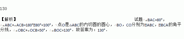 如图,点O是△ABC的内切圆的圆心,若∠A=80°,则∠BOC=____°.