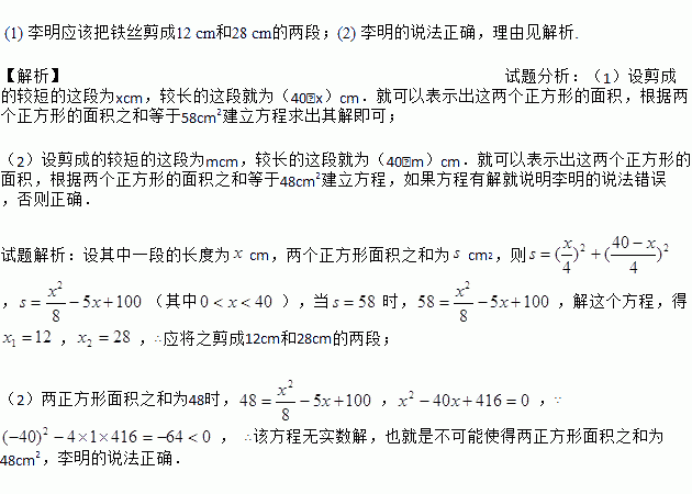 (1) 李明应该把铁丝剪成12 cm和28 cm的两段;(2) 李明的说法正确,理由见解析. 【解析】试题分析:(1)设剪成的较短的这段为xcm,较长的这段就为(40﹣x)cm.就可以表示出这两个正方形的面积,根据两个正方形的面积之和等于58cm2建立方程求出其解即可; (2)设剪成的较短的这段为mcm,较长的这段就为(40﹣m)cm.就可以表示出这两个正方形的面积,根据两个正方形的面...