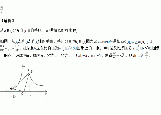 如图,点A是反比例函数y=(x>0)图象上的一点,点B是反比例函数y=﹣(x<0)图象上的点,连接OA、OB、AB,若∠AOB=90°,则sin∠A=_____